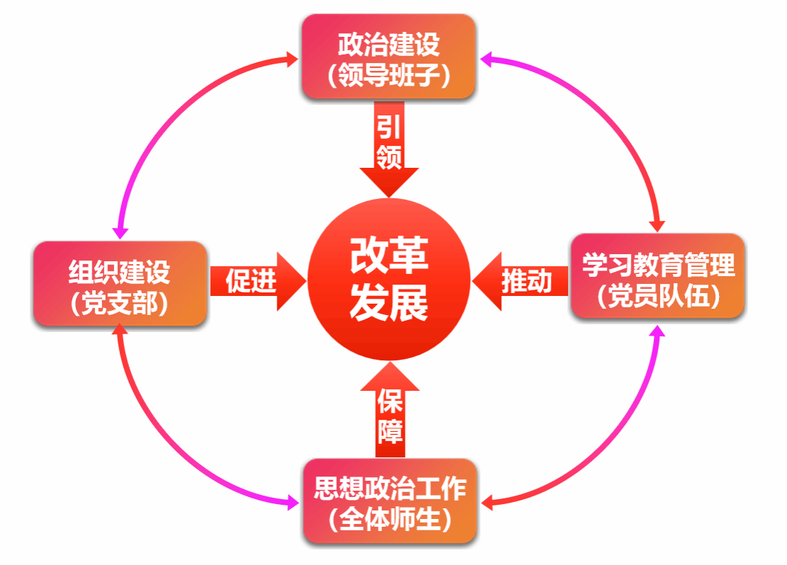 学院党委围绕着党的建设六大任务。确立了“以党的政治建设为统领,以思想、组织、作风、纪律、制度建设为保障,以平台构建、活动载体搭建为切入点,以系统协同推进为工作路径,以实现党建工作内涵式发展和学院事业持续进步为总目标”的“五位一体”党建工作体系。