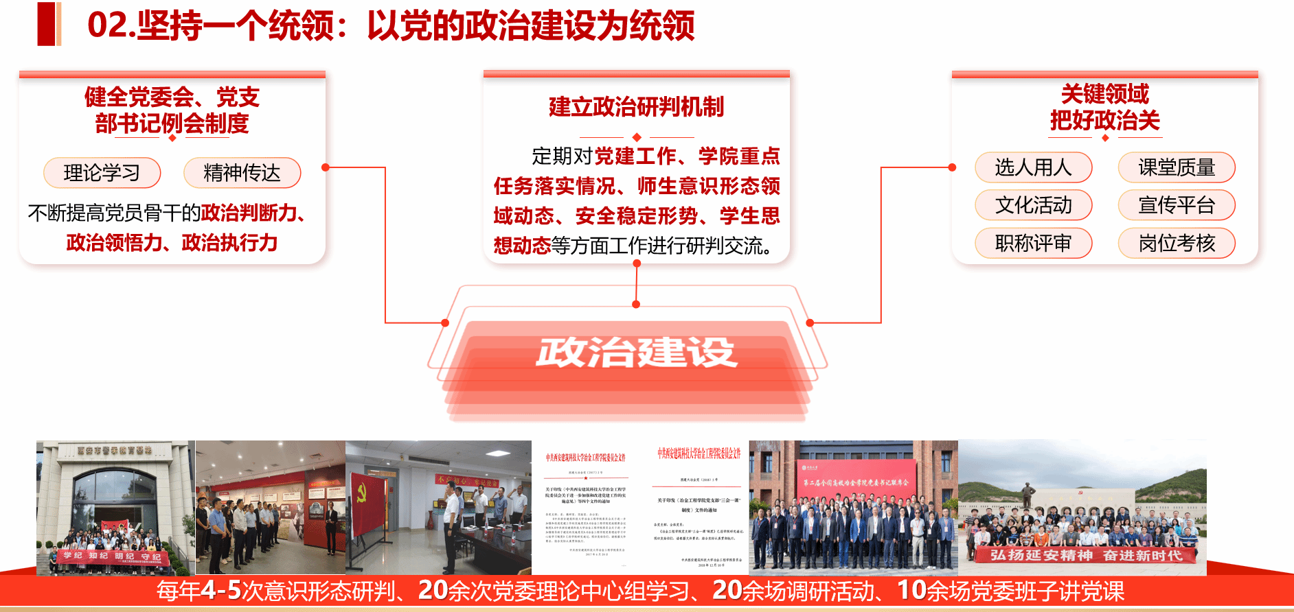 学院党委认真学习贯彻落实习近平新时代中国特色社会主义思想,以马克思主义系统观为指导,紧紧围绕党的政治建设、思想建设、组织建设、作风建设、纪律建设、制度建设,构建了“十二个一”党建工作新格局,开展了一系列理论探索和实践活动。