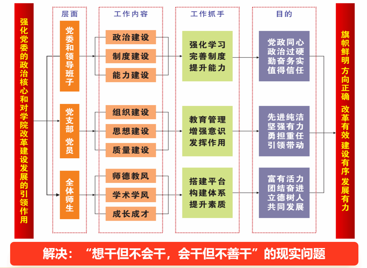 党建工作实施路径是以强化党委的政治核心和对学院改革建设发展的引领作用为出发点,以旗帜鲜明、方向正确、改革有效、建设有序、发展有力为落脚点,在领导班子、支部党员和全体师生三个层面推动党建工作。