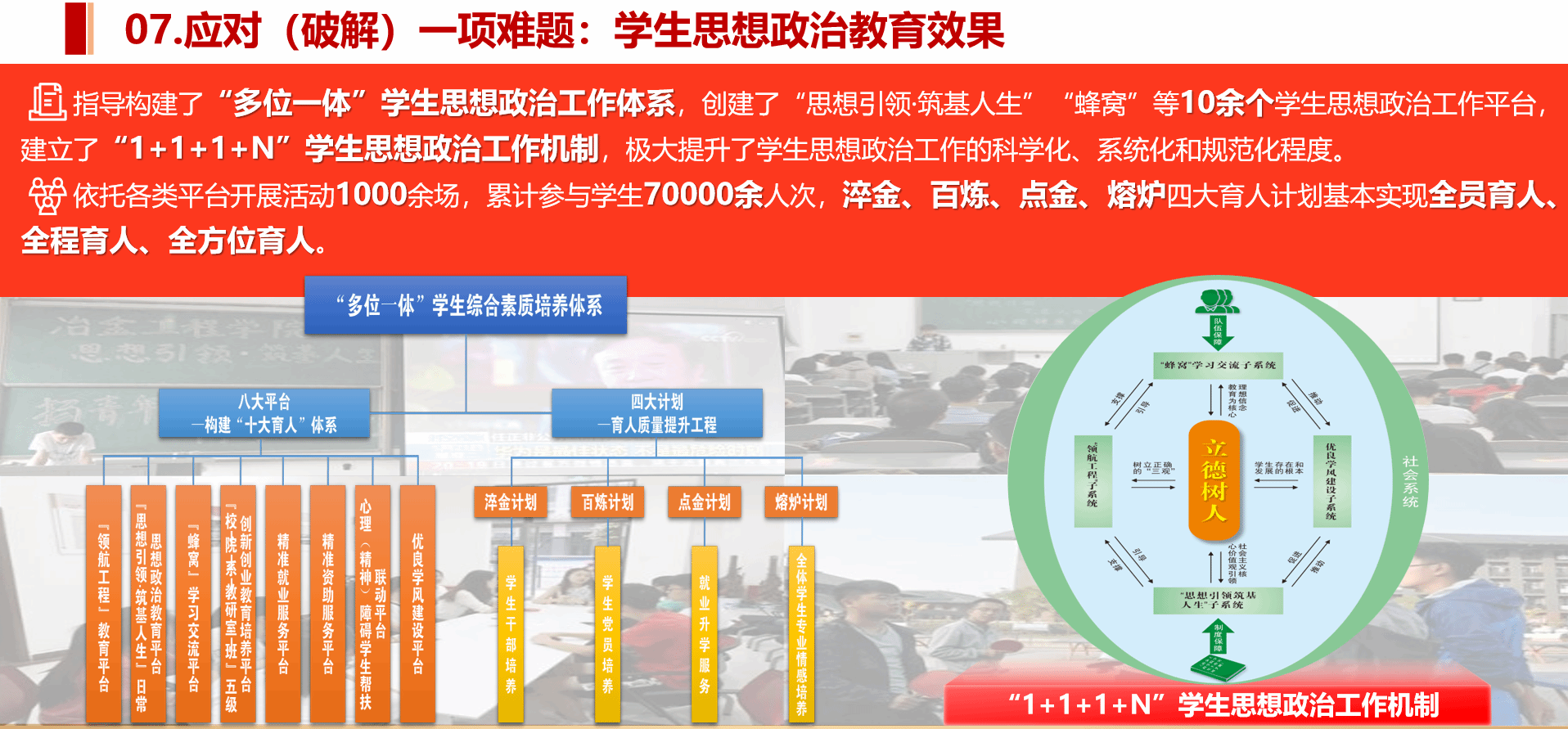 学院党委连续被评为“先进党委”,首批入选学校“党建工作示范学院”,获批“全省党建工作标杆院系”,成为全校第一个党建、团建省级“双标杆”创建学院,学院团委获“全国钢铁行业五四红旗团委(标兵)”。1个党支部入选“全国党建工作样板支部”,2个党支部入选“全省党建工作样板支部”,4个党支部入选校“党建工作样板支部”,获批“双带头人”教师党支部书记工作室2个。一流专业、一流课程、国家级人才、国家自然科学基金重点项目、国家重大科研仪器研制项目、国家重点研发计划项目都实现新突破。连续荣获“年度考核优秀学院”,荣获“陕西省师德建设先进集体”荣誉称号。