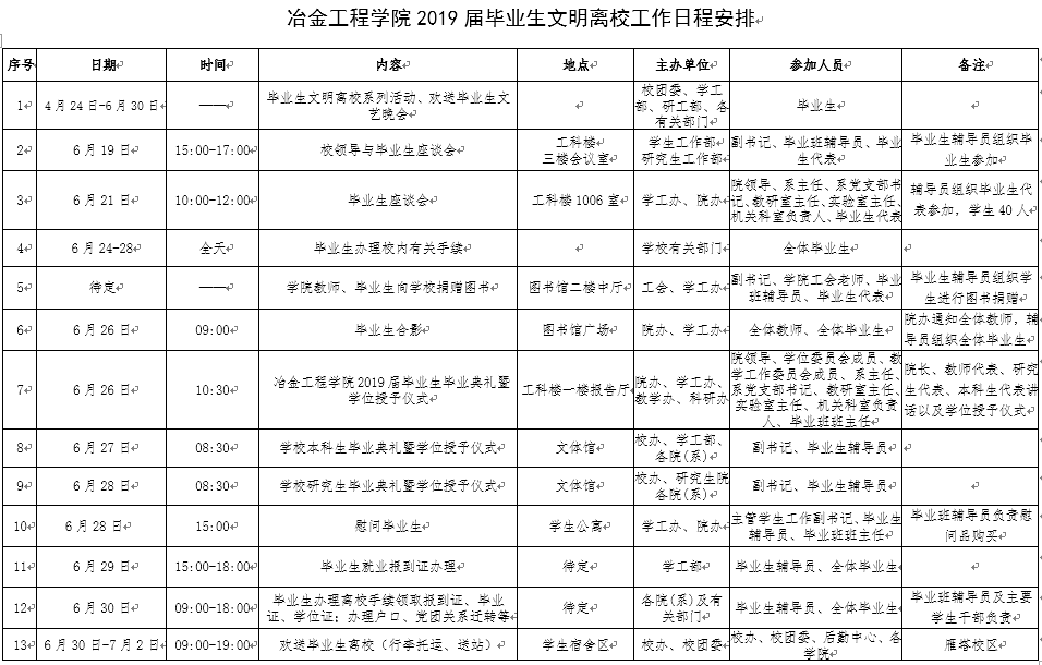 冶金工程学院网讯(通讯员 徐瑞朝)为确保毕业生文明离校工作顺利开展,发挥优秀毕业生的榜样作用,营造和谐、健康、文明、感恩的离校氛围,5月中旬,我院学生工作领导小组召开毕业生文明离校工作专题会议,安排部署2019届毕业生离校相关工作,在此基础上,制定了详细的实施方案,在毕业生离校前组织开展了丰富多彩、健康向上的毕业生文明离校系列活动。