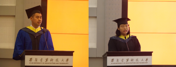 研究生代表任海涛、本科生代表柯静代表毕业生发言,他们回忆了在建大学习生活的点点滴滴,对学校、学院的精心培养和老师们长期以来的辛勤付出表示感谢,并祝愿母校、学院明天更好。