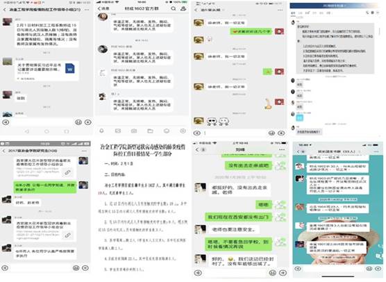 二是建立健全联络沟通机制,进一步畅通信息渠道,确保疫情防控工作数据统计和信息报送工作及时准确高效。按照学校统一要求,学院严格落实疫情防控信息“日报告、零报告”制度,学院层面,建立了学院疫情防控工作领导小组微信群,及时传达学校疫情防控工作要求,对学院疫情防控工作进行分析研判和安排部署。教职工层面,以党支部、系为单位,全体教职工每天在微信群、QQ群报告身体状况和个人动态,党支部书记、系主任负责信息收集和报送工作。学生层面,各年级均有完备的信息统计和报送机制,辅导员每天对学生动态信息进行摸排,对疫情严重地区学生、有接触史学生实行“一对一”联系,保证信息畅通。