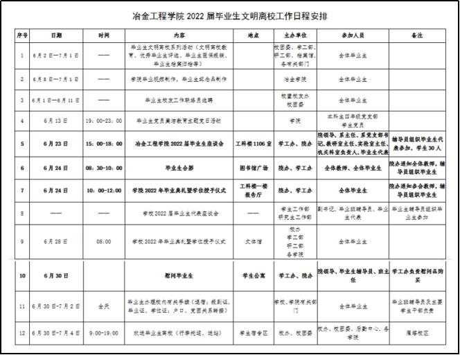 学生工作领导小组召开毕业生文明离校专题工作会议,安排部署2022届毕业生毕业离校相关工作,制定了详细的工作方案,组织了丰富多彩、健康向上的毕业生文明离校系列活动。