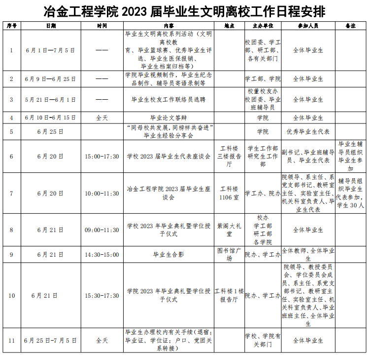为确保2023届毕业生文明离校工作顺利开展,营造和谐、健康、文明、感恩的毕业氛围,冶金工程学院学生工作领导小组召开毕业生文明离校专题工作会议,安排部署2023届毕业生毕业离校相关工作,制定了详细的工作方案,组织了丰富多彩、健康向上的毕业生文明离校系列活动。