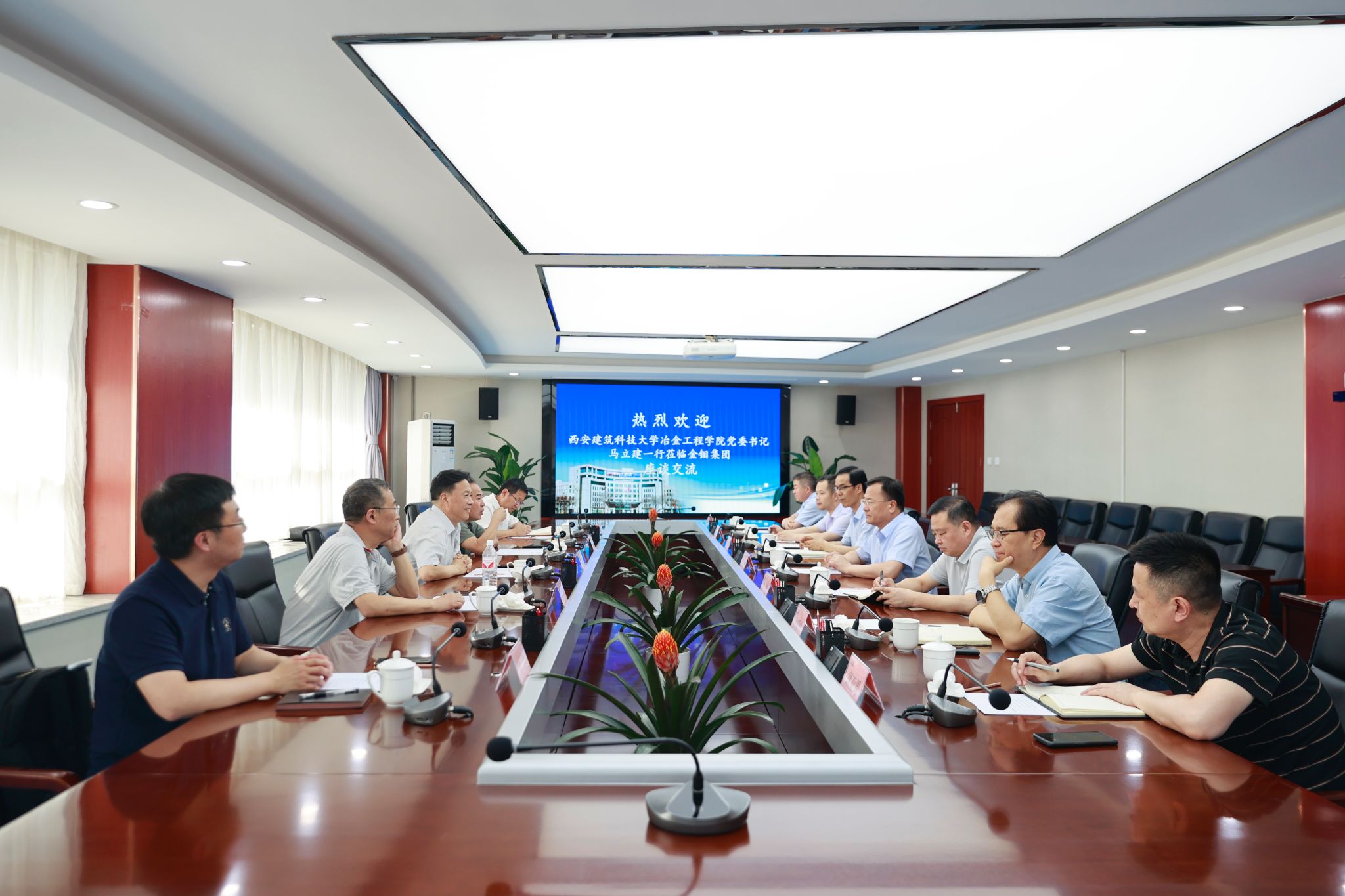 马立建对校友严平、陈超履新金钼集团党委书记、董事长、总经理表示祝贺,并从学院历史、学科及平台建设、师资队伍、人才培养等方面介绍了学院基本情况,并重点交流了学院在党建、师资队伍建设、学生就业、实习实践、教师实训等方面的成绩。李林波介绍了学院与金钼集团合作历程,学院科研团队、科研方向、科研成果以及校企合作情况。他们共同表示学院在有色冶金及加工领域积淀深厚,与金钼集团业务发展有良好的契合度,希望双方进一步搭建好交流合作平台,在人才培养、科研攻关、成果转化等方面深度合作,携手推动校企双方高质量发展。