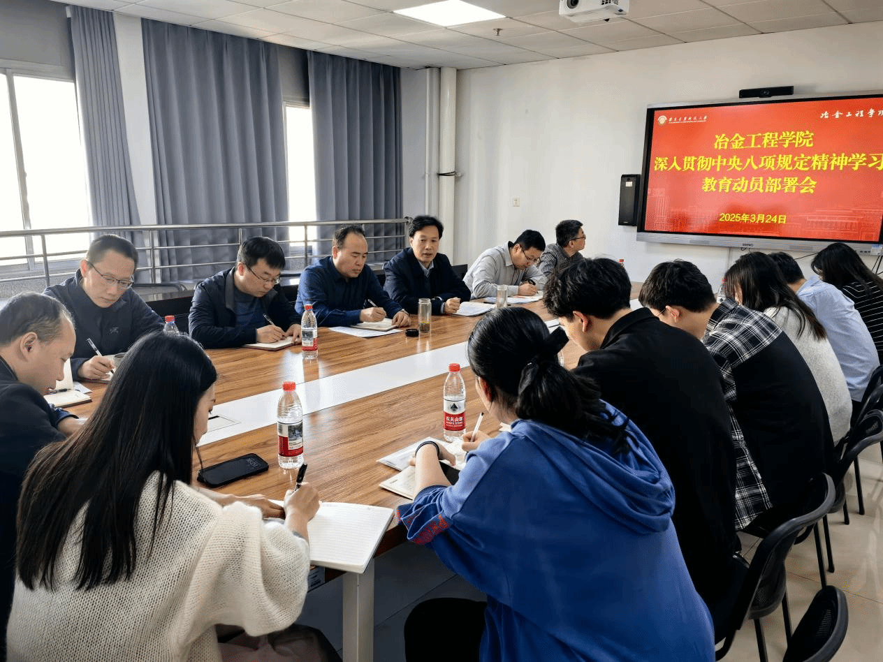 3月24日下午,冶金工程学院党委在工科大楼1102会议室召开深入贯彻中央八项规定精神学习教育动员部署会,传达学习中央党的建设工作领导小组会议以及省委常委会会议暨党的建设工作领导小组会议精神。解读了《关于在全校开展深入贯彻中央八项规定精神学习教育的实施方案》和《关于在全院开展深入贯彻中央八项规定精神学习教育的实施方案》,学院党委委员、纪委委员、各党支部书记参加会议,党委书记马立建主持并作动员部署讲话。