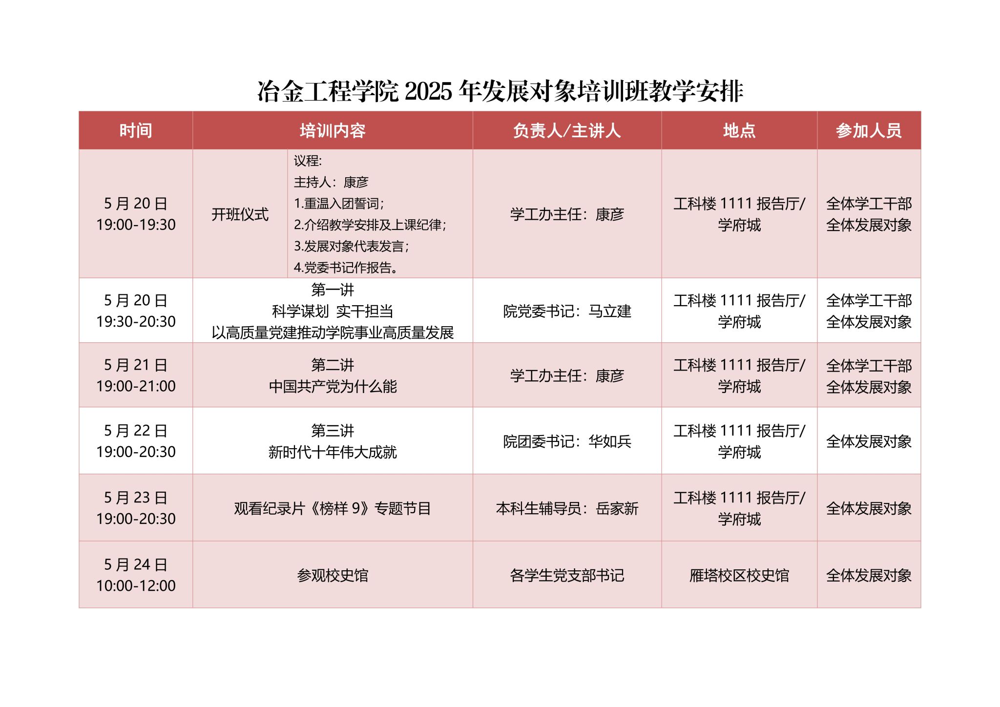 5月20日晚,冶金工程学院举办2025年发展对象培训班开班仪式。本次培训采取“线上+线下”相结合的方式,在两校区同步进行。学院党委书记马立建,党委副书记、副院长赵福才出席开班仪式。各年级辅导员,各学生党支部书记、委员,全体发展对象和部分学生干部参加仪式。仪式由学生工作办公室主任康彦主持。