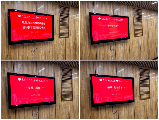 学院积极响应“为教师亮灯”公益活动号召。学院在工科楼、实验楼等建筑的电子显示屏滚动播放“以教育家精神铸魂强师,谱写教育强国建设华章”“老师,您好!”“教师节快乐!”等祝福语,用温暖的灯光向全体教师致敬,营造浓厚的节日氛围。