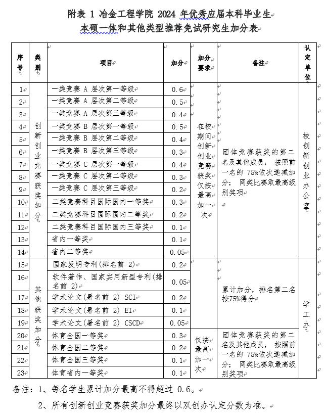 其中正常推免生加分参照《西安建筑科技大学大学生创新创业竞赛获奖奖励一览表》,本硕一体加分参照《冶金工程学院2024年优秀应届本科毕业生其他类型推荐免试研究生加分表》(附表1)。