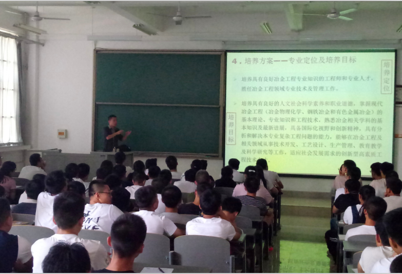 为帮助2017级新生尽快了解专业发展,完成个人学业的设计,9月6日,冶金工程学院教学办组织了2017级新生的专业介绍活动,邀请化工教研室主任张秋利、材成教研室主任王强、金属教研室主任胡平、冶金教研室主任施瑞盟四位老师赴草堂校区,为同学们进行了精彩的宣讲。