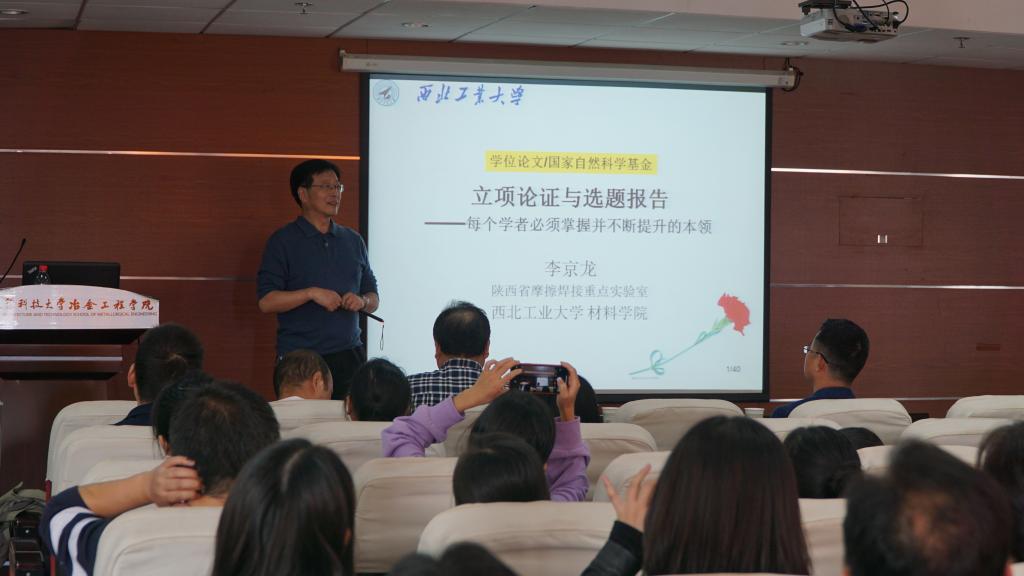 大会第二阶段由西北工业大学教授李京云老师作“立项论证与选题报告—每个学者必须掌握并不断提升的本领”的报告。李教授的报告深入浅出,从捋清选题背景、提出研究现状综述与问题、制定研究目标的设立与研究内容、论证研究方案与可行性,最后制定报告的进度安排做了详细的说明,以自身申请国基金的经验为例,让所有老师和同学受益匪浅。