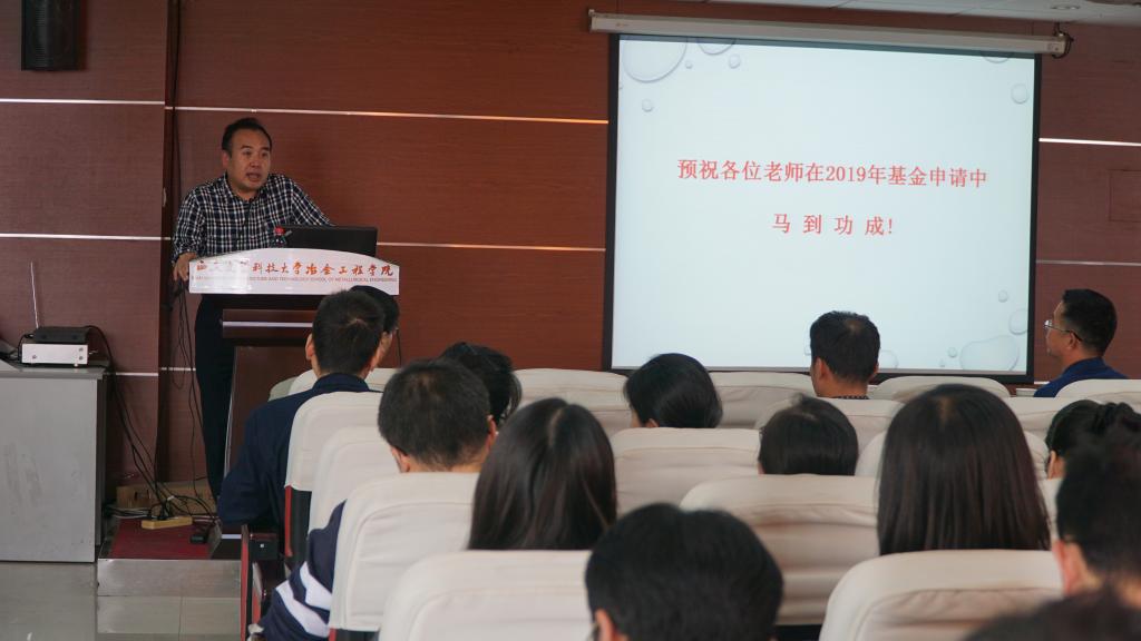 会议首先由冶金工程学院李林波院长作2019年国家自然科学基金申报动员。李院长先分析了近两年我院及各学院在国家自然科学基金申报及获准情况,肯定各位老师的成绩;接着分析了近十年工程与材料科学部国家自然科学基金面上和青年项目资助情况,最后将2019年国基金申报工作的安排、要求以及我院可申报人数做了详细的说明,要求每位老师积极申报,预祝老师能马到功成。