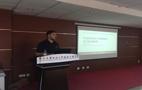 讲座开始,Viadisav Paley和Viadislav Yakubov两位老师分别讲解了英语学术论文的写作以及中文与英语的差异及不同用法,并详细的讲解了一些英文论文写作和中文论文的写作中一些典型词汇的用法、语法以及语言环境,这些对于同学们在之后的英文论文写作中都大有裨益。接着,Alex A. Volinsky教授就自己多年的科研经历和我院的研究生同学们做了一些交流。Alex A. Volinsky教授讲解了薄膜加工及其机械性能和特性,薄膜材料的粘附性和薄膜的断裂,纳米压痕,力学性能与表征,辐射材料的性能和XRD分析,医用Co-Cr-Mo合金制备及研究分析及材料的环境退化等领域的研究。