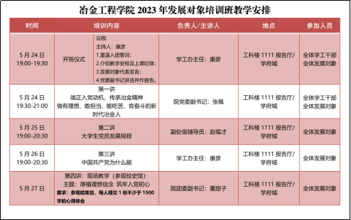 5月24日晚,冶金工程学院举办2023年发展对象培训班开班仪式,本次活动采用“线上+线下”相结合的方式在两校区同时进行。学院党委副书记、副院长张佩,副处级辅导员赵福才,学工办主任康彦,院团委副书记乔柯、董甜子,各年级辅导员老师,全体学生党支部委员,以及本期发展对象培训班全体学员参加了本次培训班开班仪式。仪式由康彦主持。