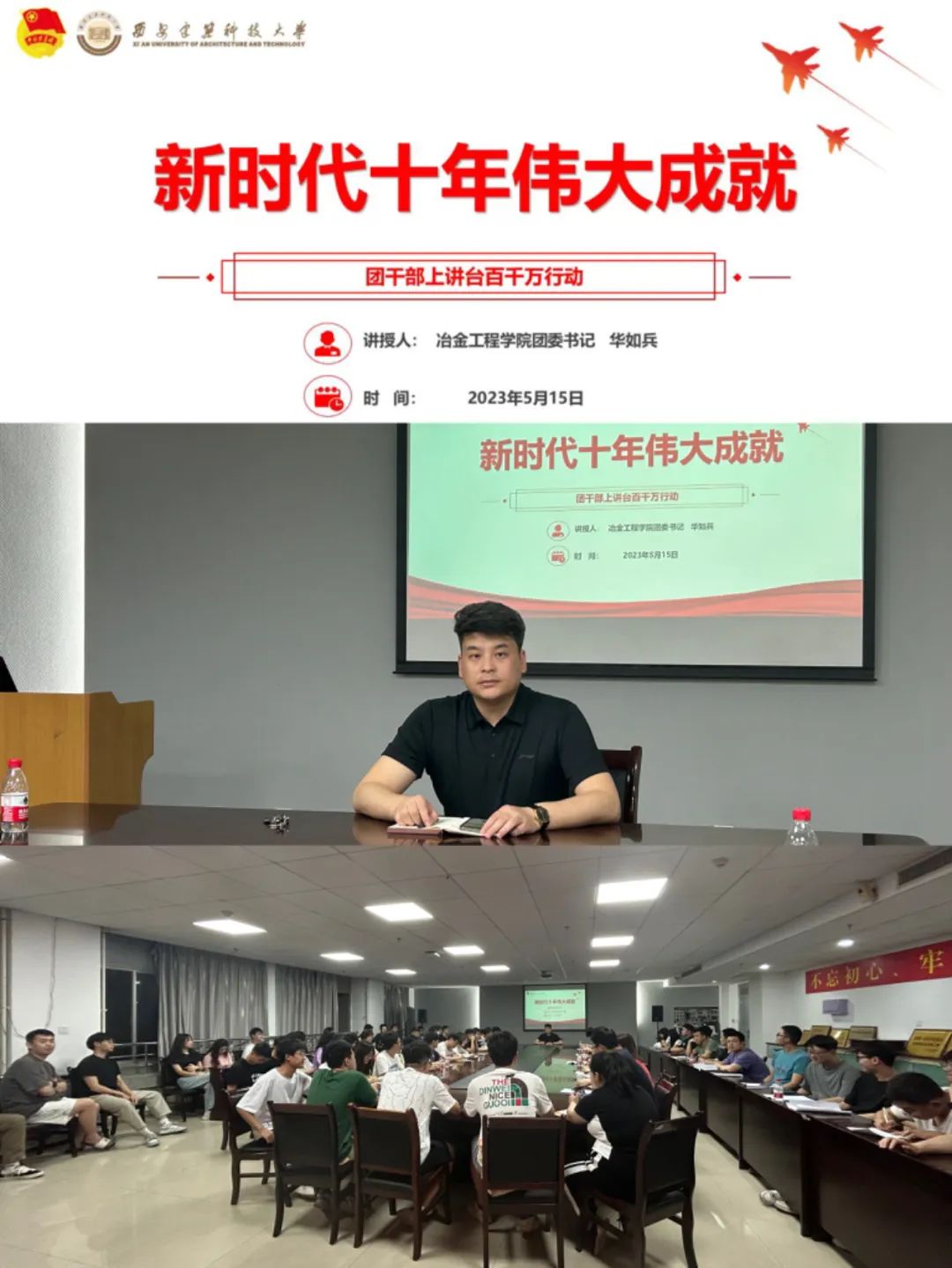 冶金工程学院团委书记华如兵老师以“中国新时代十年伟大成就”为主题为冶金学院青年学子授课。过程中,老师为同学们播放新时代近十年伟大成就视频以及向同学们讲述伟人事迹,帮助同学们了解新时代十年伟大变革,感受新时代发展之快,明确自身目标,同时有助于激发我院学子的爱国热情,增强责任意识,努力成为一名推动祖国未来发展的、对社会有贡献的新时代青年。
