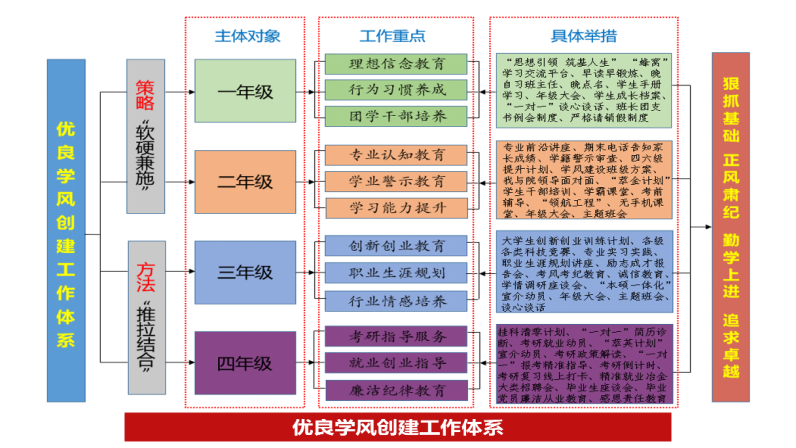 坚持问题导向,久久为功,是优良学风创建的基本思路。华如兵全面系统梳理分析所带学生特点,探索建立了年级优良学风建设工作体系,按学期制定班级学风建设方案,坚持“开始有计划—过程有督导—期末有总结”闭环工作模式,狠抓实抓长期抓,实现了学生由他律向自律、被动学向主动学的良好转变。2022届毕业生深造率、去向落实率、四级通过率等学风建设标志性指标均位于学校前列。