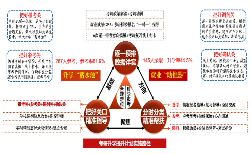 老题新作,常做常新。第二届学生,考研升学、就业创业是华如兵面临的两道老题。面对学生考研热,他探索建立了“‘四关’工作法—考研升学提升计划”。根据学生学业成绩GPA分时分类“一对一”精准科学指导,把好四个重要关口,做大升学“蓄水池”,用好就业“助推器”,2022届考研录取145人,升造率44.5%,增长15.2个百分点,提前完成学院“十四五”规划目标任务,所带的两届学生升学率实现了翻番。