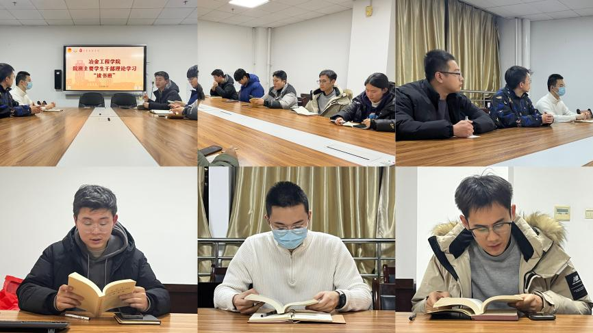 为提高我院学生干部的理论学习水平、提升思想境界和政治觉悟,进一步强化理论武装,在学懂弄通做实上下功夫,做政治上的明白人,冶金工程学院研究生会积极响应校团委和上级学生组织的工作要求,结合学院自身的发展情况,在学院团委的指导下,于2024年1月4日19:00在雁塔校区工科楼1102会议室召开冶金学院研究生会-班级主要学生干部理论学习读书班。冶金学院研究生会主要学生干部、2022级和2023级研究生各班班长参与会议。会议由研究生会执行主席郭楠主持。