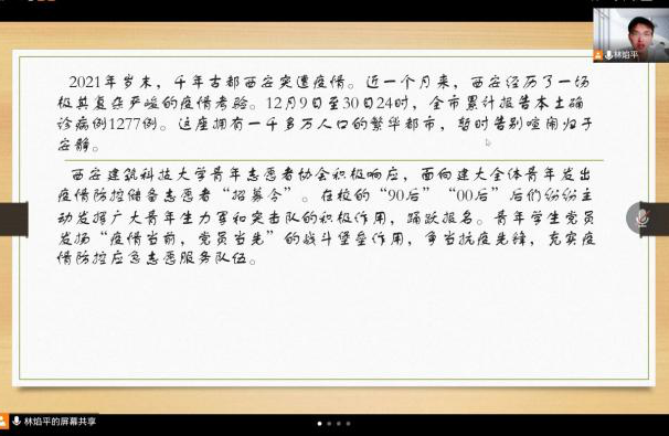 班会伊始,班长林焰平深度解析了敬畏的内涵,告诉同学们应该敬畏法律,敬畏自然,也更应该在学校做好学生的本分工作。随后班长林焰平表示在当今疫情之下同学们应该对医护人员及全体志愿工作者怀有感恩之心,没有他们就没有我们如今安全的生活。