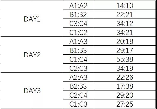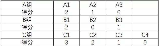 胜一场记一分,负不得分。A、B组得分最高出线,C组出线两个队伍。