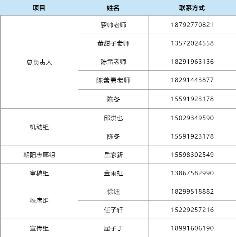 运动会各项负责人联系方式
