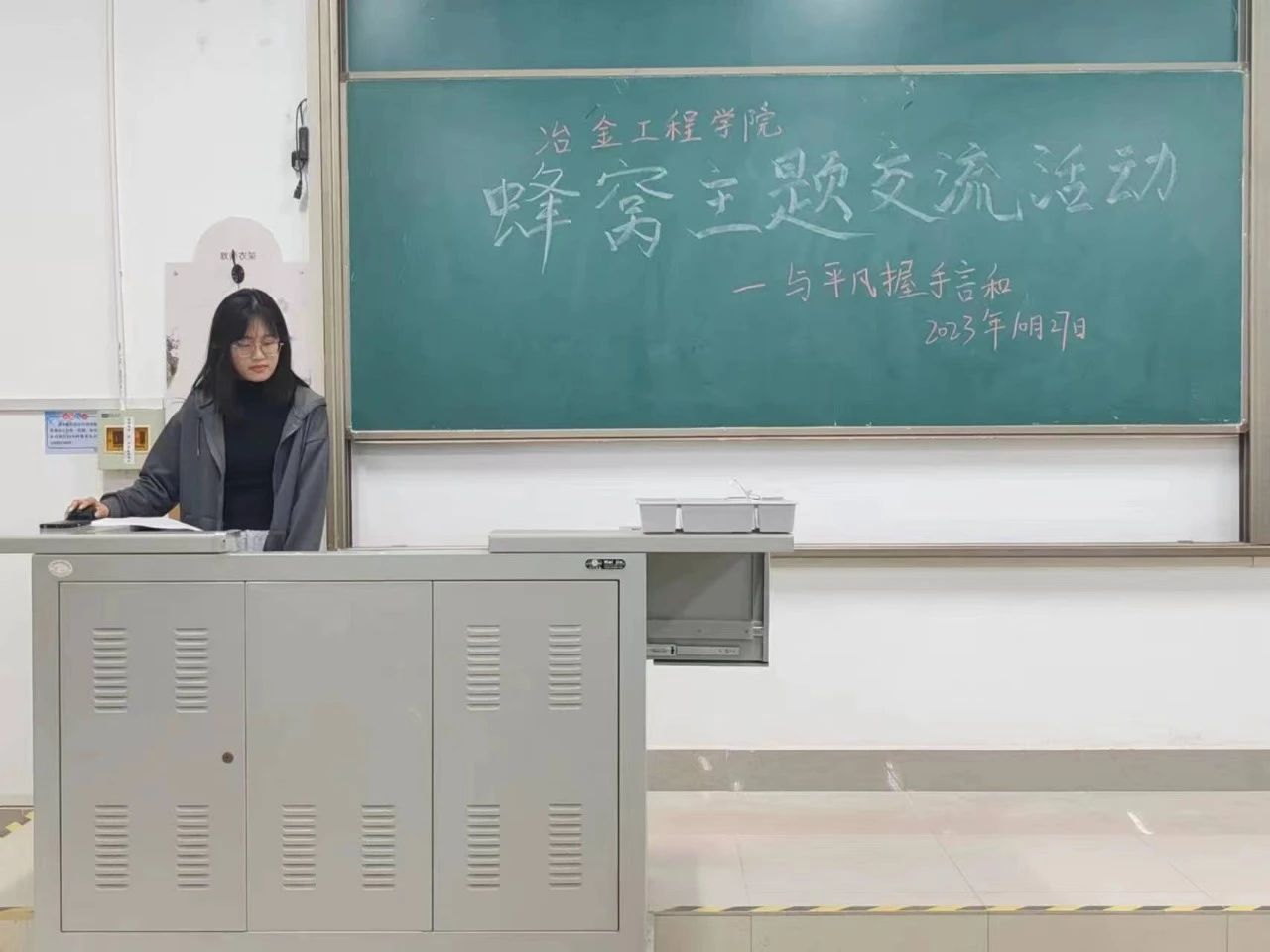 为鼓励同学们勇敢记录生活,在生活的点点滴滴中找寻自我价值,感悟生活美好。冶金工程学院学习部于10月27日19:30在学府城9-107组织开展第三期蜂窝交流实践平台活动——与平凡握手言和。此次活动由材成2203刘凯和材成2303解欣哲主持。