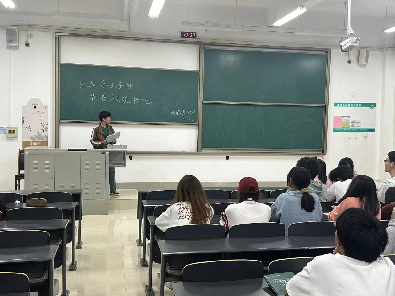 为了引导同学们树立遵规守纪的意识,培养学生遵规守纪的良好习惯,营造积极向上的学习氛围,4月23日,冶金工程学院23级各班成功举办了以“遵规守纪促学风”为主题的特色班会。此次活动响应学院“遵规守纪促学风”专题活动。各班学生积极参与,各班班长组织全体学生重温一次学生手册,敬畏每一条校规校纪,强化一次考风考纪教育,开展一次廉洁教育,学习大学生行为规范和《中华人民共和国网络安全法》,解读一次社会公德和社会主义核心价值观,教育引导全体学生遵守校规校纪,受警醒、明底线、知敬畏。