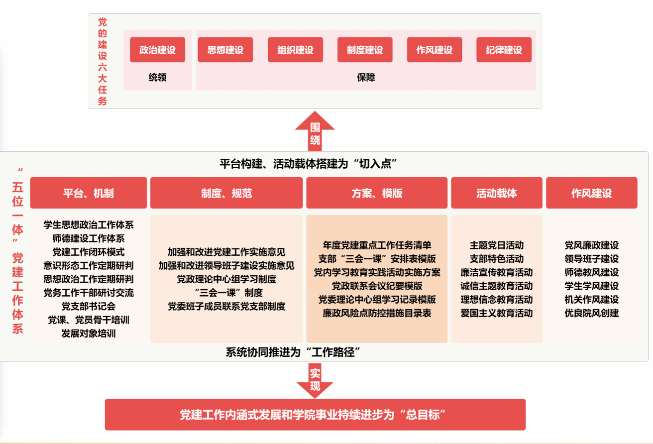 学院党委围绕着党的建设六大任务。确立了“以党的政治建设为统领,以思想、组织、作风、纪律、制度建设为保障,以平台构建、活动载体搭建为切入点,以系统协同推进为工作路径,以实现党建工作内涵式发展和学院事业持续进步为总目标”的“五位一体”党建工作体系。