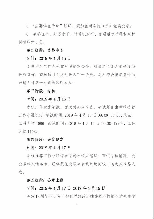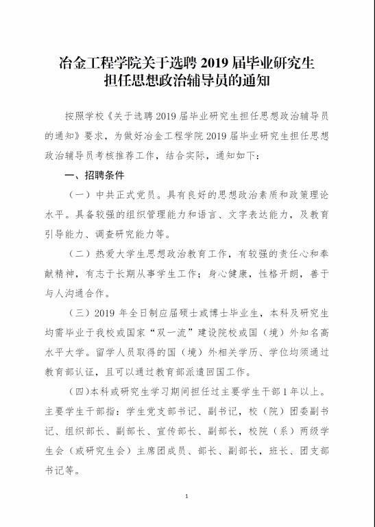 冶金工程学院关于选聘2019届毕业研究生担任辅导员的通知