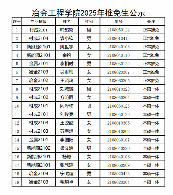 冶金工程学院2025年优秀应届本科毕业生免试攻读研究生推荐名单进行公示,公示期自2024年9月14日17:30——9月18日11:30,对公示结果有异议者,请将实名签署的书面申诉材料,于工作日交学院教学办(工科楼1105B)。逾期视为无异议。