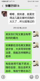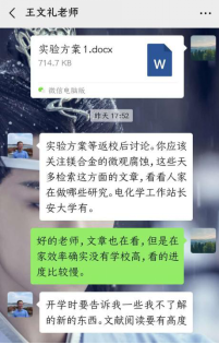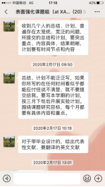 杜忠泽老师通过微信语音会议的形式组织毕业论文讨论,是杜忠泽老师课题组的假期常态,每一位同学就自己的完成进度以及内容进行报告,大家围绕报告内容进行深入讨论,并提出完善意见,推进进度。王伟老师在假期给同学们布置了学术任务,并通过微信给予了大家远程指导。在此期间,他也一直在师门群里鼓励大家利用假期时间学习、休息,在疫情防控期间保重身体。