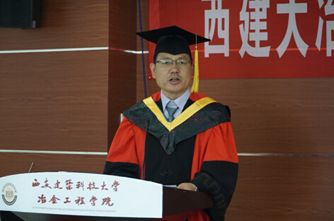 院长王快社致辞,在毕业典礼上致辞,他回顾了毕业生在校期间的学习生活,肯定了他们取得的成绩,并深情的表达了对他们的祝福,并向长期以来关心爱护学生、帮助学生健康成长的全体导师、教职员工以及父母家人,表示衷心感谢。最后,他向在座毕业生提出了三点要求:希望毕业生永远感恩,做到常怀感恩之心、常做感恩之事、常说感恩之言,学会感恩身边的每一个人。在新的工作岗位上,脚踏实地,从一点一滴做起,坚定执着的面对挑战,开拓事业。在面对机遇和挑战时,要鼓足干劲、奋勇前进,努力实现自己的梦想,力争成为冶金工程学院的新的骄傲。