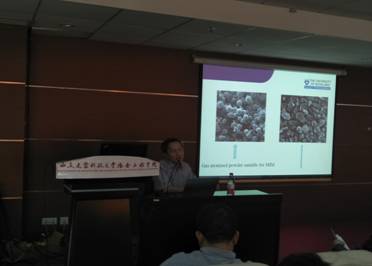 本次报告会主要讲的是钛合金注射成型,以及钛合金广泛应用于航空航天及民用行业,将钛合金和钢、铝做对比,钛合金明显表现出优越性。曹教授首先从新西兰最初研究钛合金开始,经过不断发展,成企业规模。简单介绍了钛合金注射成型工艺包括原料混合,模具挤压,去除高分子,最终成为全固态,特别适合于大批量,中小件,形状复杂零件的生产。此种工艺控制的难点在于控制氧含量(最低控制在0.13%),粉末冶金中钛粉成型比较困难。曹教授还特别提出了TC4力学性能中最重要的是它疲劳性能的控制以及β钛合金成型过程需要解决的关键问题。最后曹教授特别热情地回答了广大师生提出的问题,大家均收获颇丰。