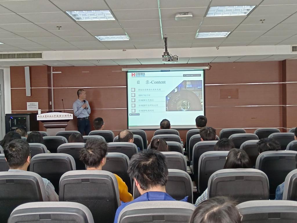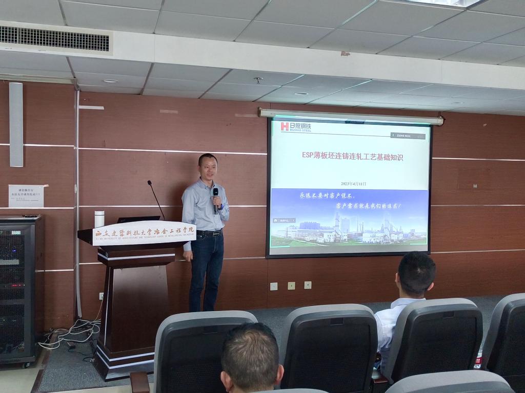 首先冶金工程学院副院长杨西荣教授为日照钢铁喻尧部长颁发本科教学指导教师聘书,接下来喻部长从博板坯连铸连轧技术发展、ESP产线介绍、日钢ESP工艺特点、日钢ESP产品研发应用、日钢ESP发展规划五个方面介绍了ESP薄板坯连铸连轧技术,报告结束后学院老师与喻部长就ESP薄板坯连铸连轧技术进行了交流。