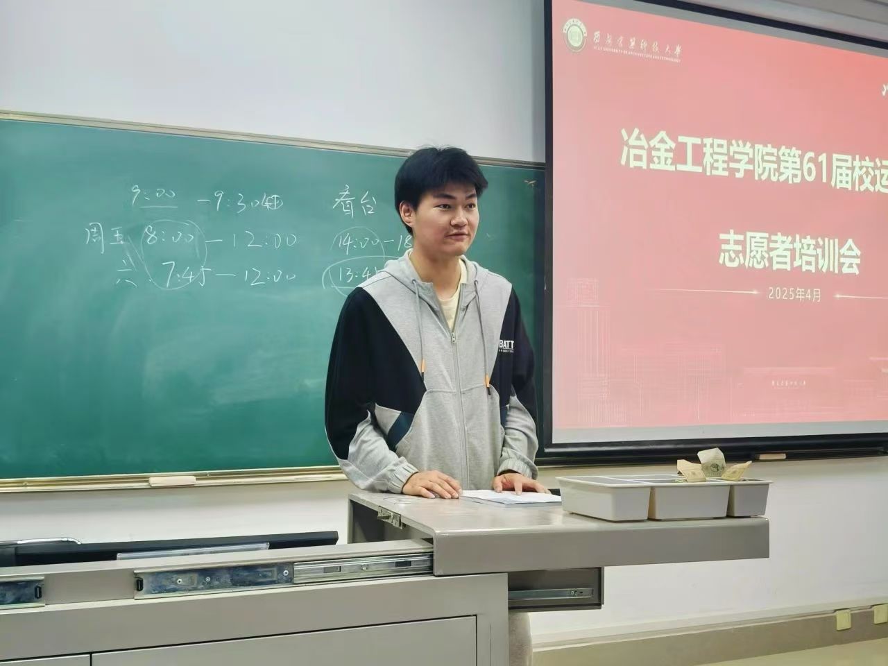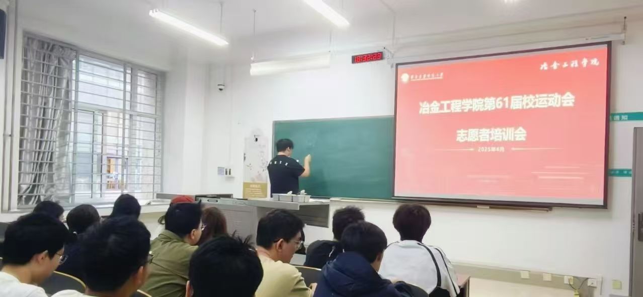 为明确岗位职责,统一服务流程,合理分配人力资源,冶金工程学院于4月24日18:00在学府城13-103开展运动会志愿者培训会,参加本次培训会的有团委志愿服务中心负责人武乃涛、主席团成员郭浩男。