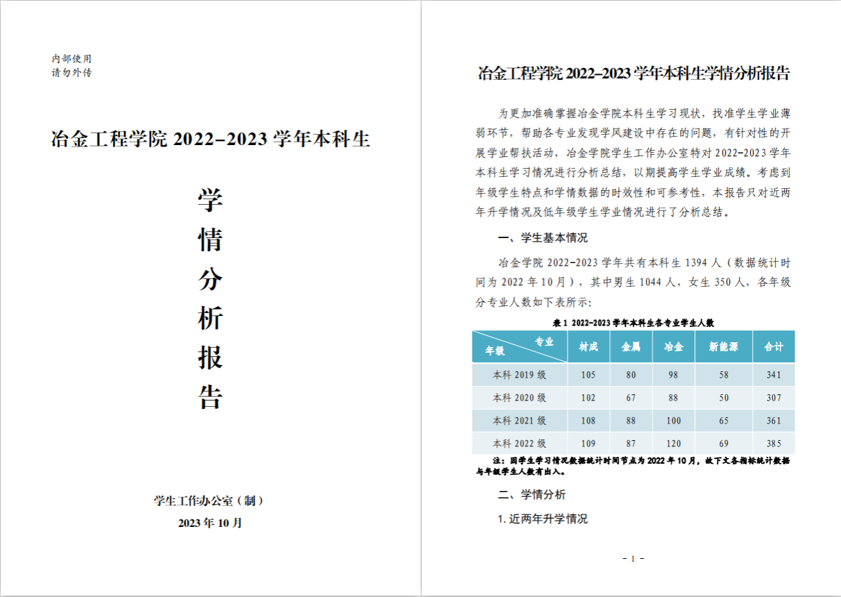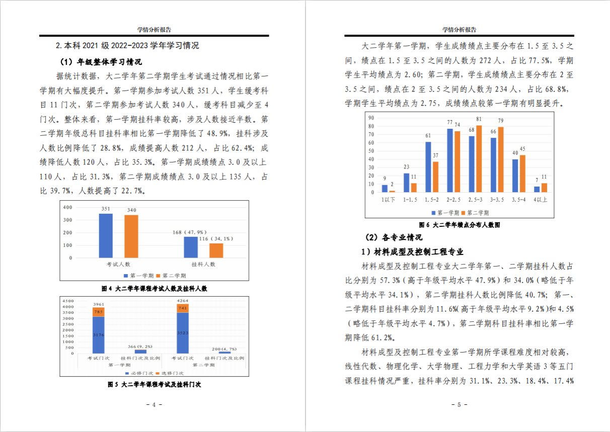 2022-2023学年本科生学情分析报告》。报告从学生基本情况入手,建立学院学生学习成绩数据库,研究学生学业发展与成长规律。通过研究分析考研升学率,各年级专业挂科门次、挂科率、绩点分布等,准确掌握学生学习动机和学习状态。针对存在的各类问题,建立家校沟通机制,进一步做好学生日常学习教育和管理。