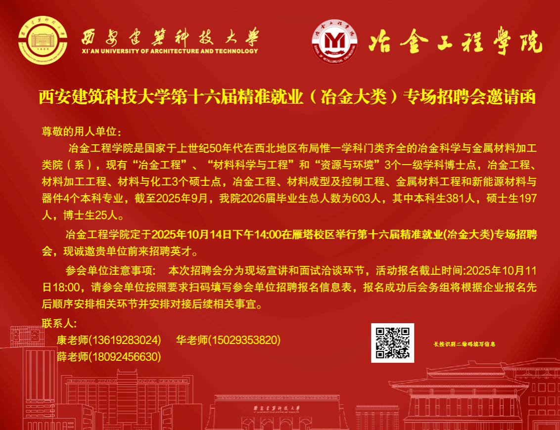 西安建筑科技大学第十六届精准就业(冶金大类)专场招聘会邀请函